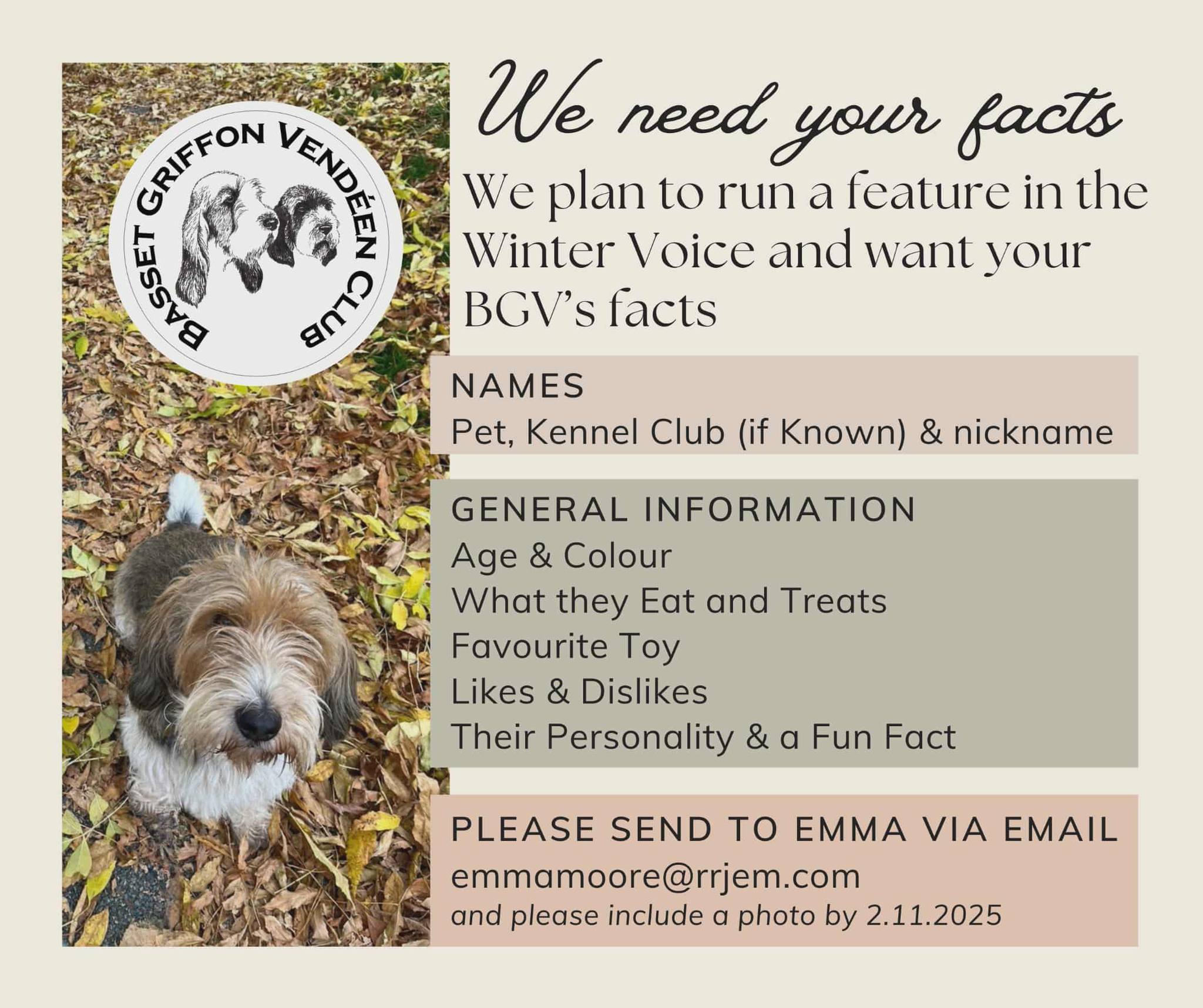 IMPORTANT INFORMATION THE BGV CLUB HAVE A NEW MEMBERSHIP SECRETARY Membership Secretary: Mrs Fiona Morris, Hermitage, Mount Pleasant, DUNS, Berwickshire, TD11 3HU Tel: 07971 406817 Email: bgvmembershipsecretary@gmail.com Membership Renewals As the renewal period is now upon us, this is a gentle reminder that annual subscriptions are due by 31st January 2025. Renewing by this date ensures you retain your voting rights, as we want to ensure your voice is heard! For members submitting renewal fees by post, please forward all cheques to Fiona at the address listed above. For those renewing via online banking, the Club’s details are as follows: Account Name: Basset Griffon Vendéen ClubSort Code: 40-39-07Account Number: 11573128Bank: HSBC Please quote reference: “your name + MEMBERSHIP” e.g. J Smith MEMBERSHIP For ease of annual renewal, please consider setting up a Standing Order.